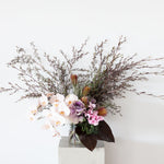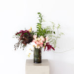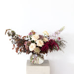 Rambling burgundy and opulent jewel toned flowers, softened with a creamy bespoke flourish. Flowers for glamour, romance, or just because.