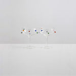 Introducing the Pomponette champagne coupes, a playful set of handmade clear glasses decorated with jewelled multi-coloured bubbles. We strongly recommend inviting the Pomponette duo to all celebrations, they make the most satisfying clink!